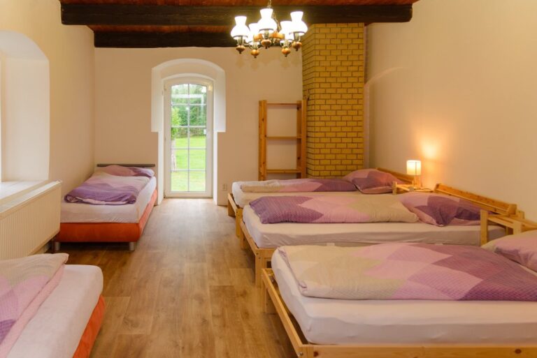 Ubytovaní budeme v útulných, různě velkých pokojích. Dále bude k dispozici krásný sál (možnost využít také ke spaní na matraci v případě obsazení pokojů), jídelnu (možnost jíst také ve venkovním zastřešeném prostoru), dětské hřiště (houpačka, skluzavka, pískoviště) a malebnou okolní přírodu. K dispozici máme nádhernou louku, rozlehlý les.
